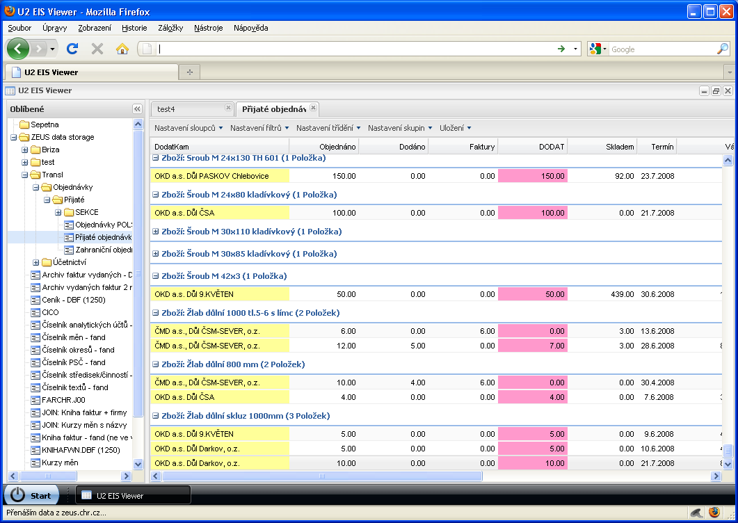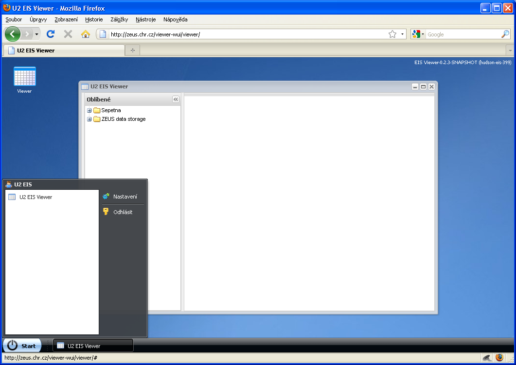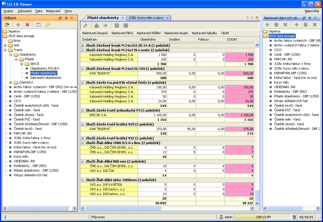 Po spuštění a přihlášení do programu se zobrazí hlavní okno. Podél levého okraje okna se nachází nabídka datových pohledů, které má právo přihlášený uživatel vidět. Nabídka je koncipována ve stromové struktuře. V první úrovni jsou zobrazeny složky (větvičky) datových úložišť a v nich se nachází nadefinované datové pohledy a/nebo další podsložky s datovými pohledy. Správce vidí navíc ve složce datového úložiště i datové zdroje, aby z nich mohl vytvářet datové pohledy. V nabídce datových pohledů po dvojkliku na datovém pohledu (nebo datovém zdroji) se na ploše hlavního okna zobrazí okno s tabulkou a v ní se zobrazí data. V hlavním okně může být otevřeno více datových pohledů současně, přepínat mezi nimi můžete vybráním příslušné záložky nad oknem (pod hlavní nabídkou). Při ukončení programu si program otevřená okna zapamatuje a po příštím spuštění a přihlášení okna automaticky zobrazí. Informace v tabulkách je možné exportovat do Excel sešitu (*.XLS). Zobrazený pohled lze samozřejmě také vytisknout.